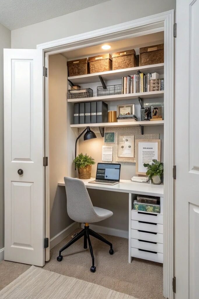 - The Cloffice: Convert a shallow closet by removing the door and installing a desk across the opening. Add shelves above and a curtain for when it’s not in use.